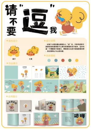 王磊老师指导、学生饶佳仪、陈怡嘉创作的作品《请不要“逗”我》获得学生组书刊设计一等奖。本设计以孩子的视角呈现孩子的内心世界,画风轻松有趣,是一本专为儿童量身打造的亲子共读绘本,真诚直率的内心独白,让家长更懂孩子的真实想法。剖析孩子内心世界的真实想法,让家长更多理解孩子,也让孩子更好地表达自己,从而建立起温馨的成长环境。