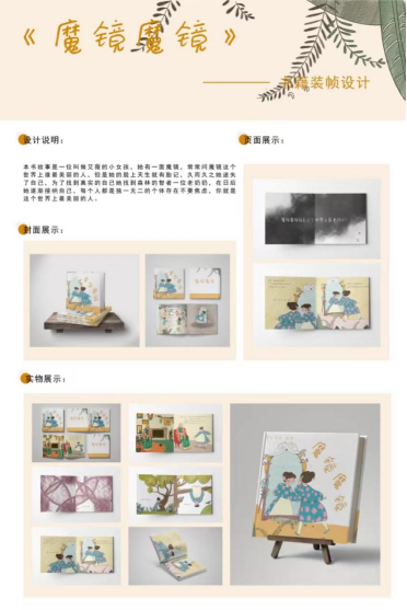 卢春梅老师指导、学生陈梦涵、刘嘉清创作的作品《魔镜魔镜》获得学生组书刊设计二等奖,此绘本描绘了一个小女孩勇敢追寻自我的动人故事。魔镜代表着自我认知和内心的探索,它引导小女孩找到了真正的自己,旨在鼓励人们在面对外界的压力和质疑时,保持坚定的信念,勇敢地探索自我,发现自己的价值和潜力。