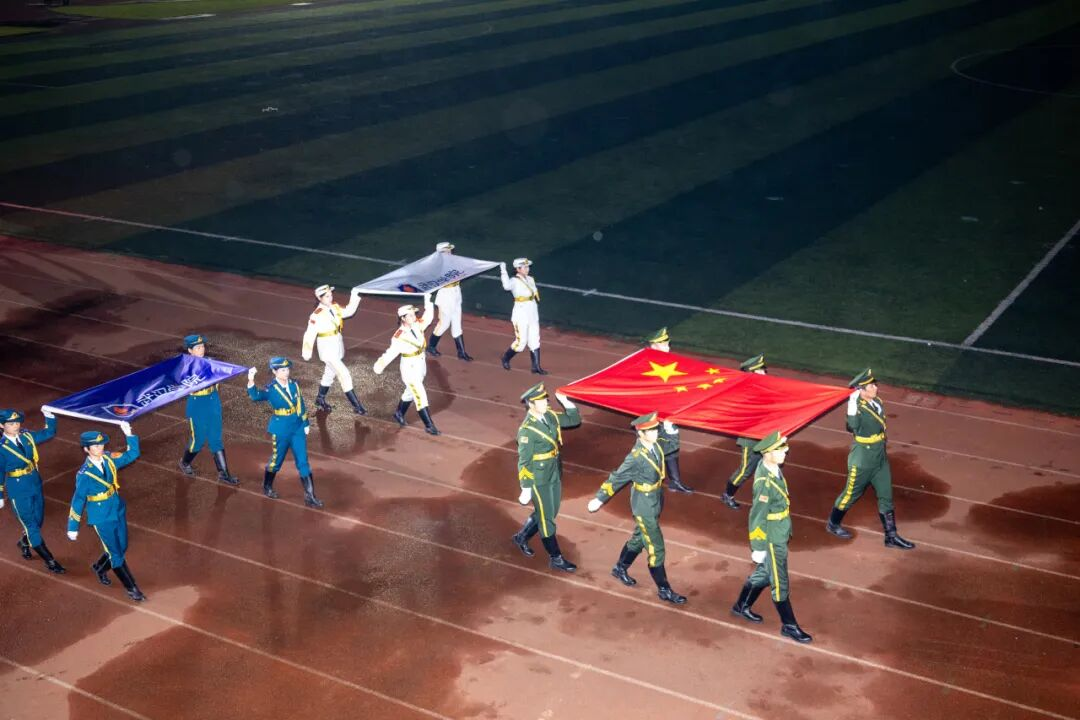 国旗护卫队步伐铿锵,擎旗入场,庄严肃穆。红旗方阵和各学院(部)代表队紧随其后,结合专业“各显神通”:算盘舞动、折扇翻转、代码光影交织,以创意表演尽显学子蓬勃朝气与青春风采。