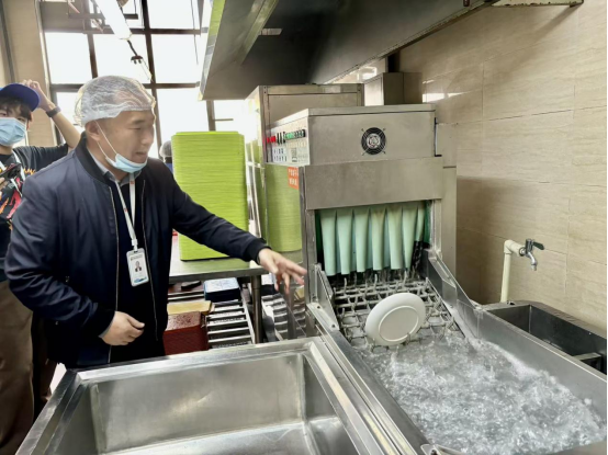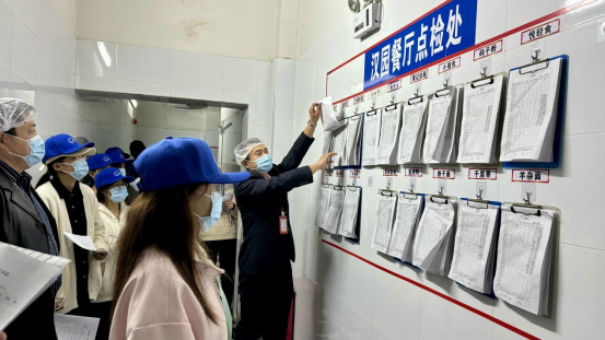 在学校食堂经理的引导下,检查小组先后走进后厨、仓库、档口及监控室等场所,围绕食品安全、环境卫生、服务质量、创新管理四大维度现场考核打分,通过现场核验、随机抽检、台账审查、后台监控观察等多元方式,对食堂运营各环节进行评估。